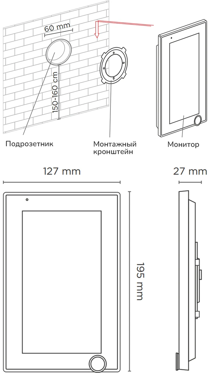 Для монтажа данных моделей видеодомофонов рекомендуется использовать стандартные подрозетники глубиной не менее 45 мм, что обеспечит достаточное пространство для размещения необходимых кабелей и разъёмов. Размеры устройств составляют 195×127×27 мм, что также следует учитывать при размещении видеодомофона.