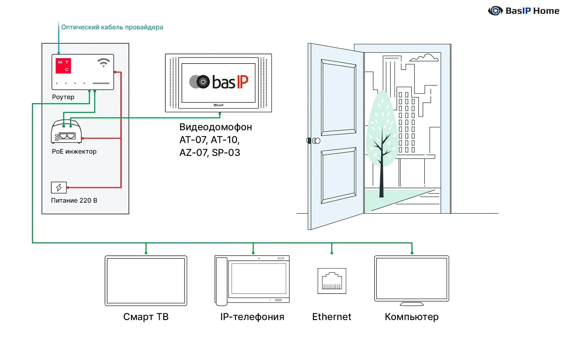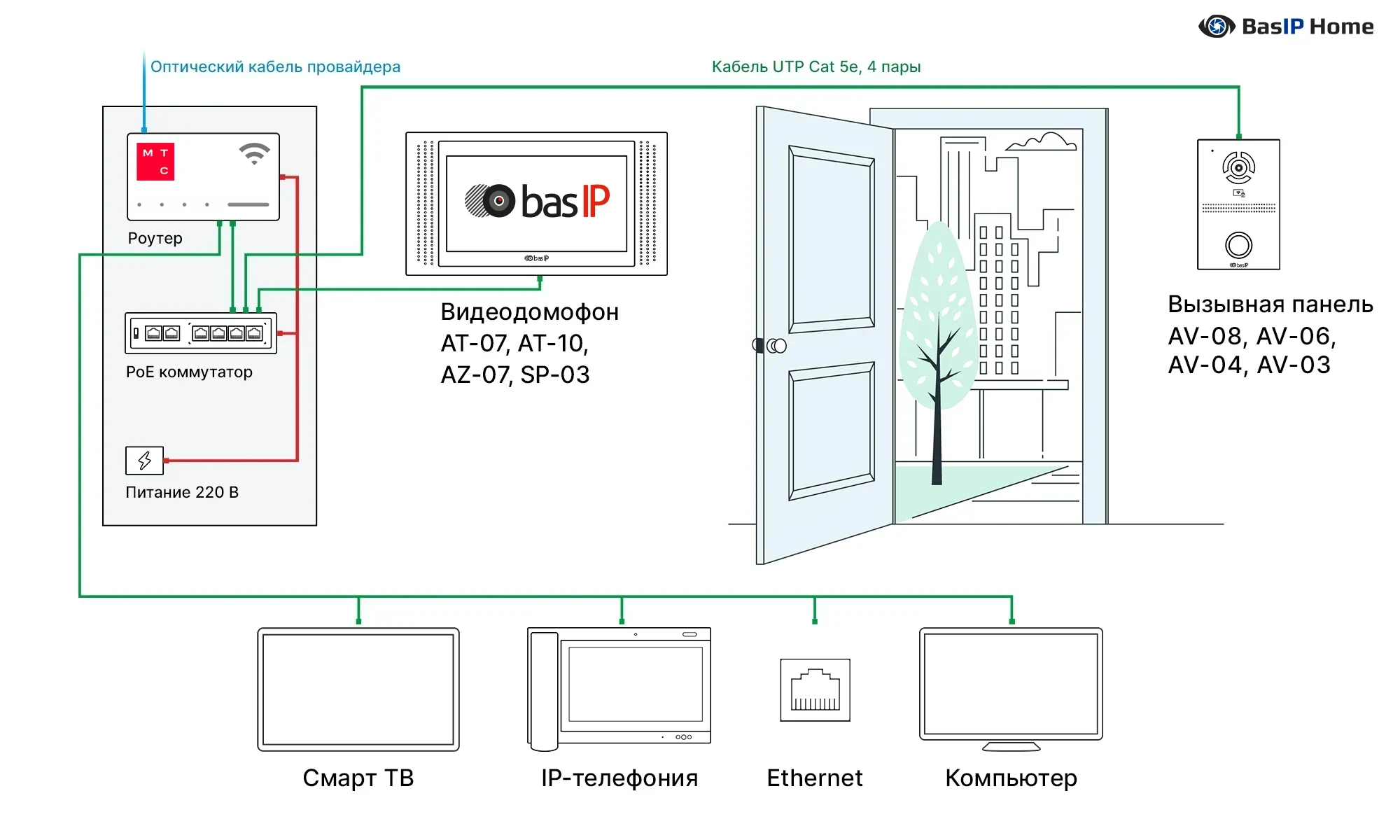 - Для обеспечения корректной работы необходимо использовать только оборудование экосистемы BAS-IP. Многоабонентская вызывная панель в подъезде будет работать именно с IP-видеодомофонами BAS-IP.